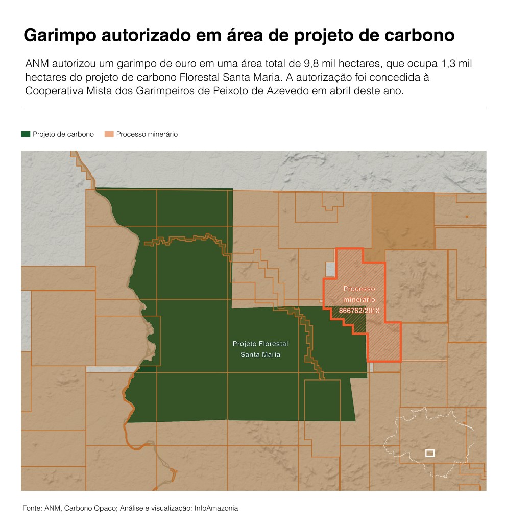 Em abril, a ANM autorizou um garimpo de ouro em uma área total de 9,8 mil hectares, que ocupa 1,3 mil hectares do projeto de carbono FSM. A autorização foi concedida à Cooperativa Mista dos Garimpeiros de Peixoto de Azevedo.