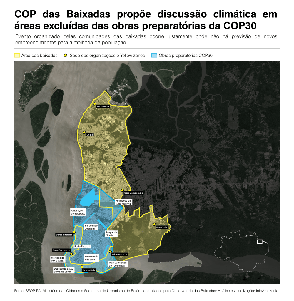 Todas as atividades da COP das Baixadas destacaram como as comunidades vêm sendo excluídas das melhorias e discussões oficiais da COP30. Um exemplo recorrente foi o planejamento das obras preparatórias para o evento em Belém. O Observatório das Baixadas, organização que atua com pesquisa, produção de dados, advocacy e ações educativas nas comunidades, analisou informações oficiais e mapeou as intervenções em infraestrutura anunciadas pelo Governo do Pará. As obras preparatórias incluem restauração de avenidas, implantação de redes de esgoto, reformas em escolas, revitalização de praças, terminais e espaços comerciais. Mas não incluem as periferias.