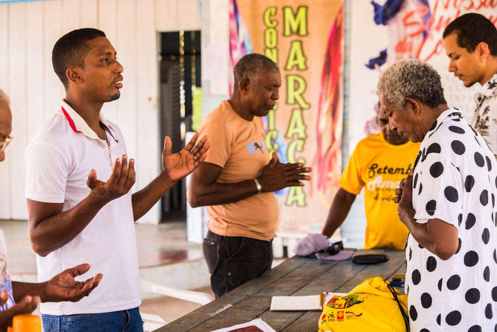 Entre os rios e as rezas, a fé continua sendo o eixo invisível que sustenta a resistência. No Maracá, os terços e ladainhas dividem espaço com os cânticos que pedem chuva, fertilidade e proteção. Durante o mês de maio, as famílias caminham até a beira do igarapé para rezar. “A gente reza pedindo chuva não só para molhar o chão, mas pra Deus lembrar da gente e das águas que nos sustentam”, explica Dona Maria do Carmo, conhecida como “Mãe Carminha”, que conduz o grupo de rezadeiras há mais de 40 anos.
