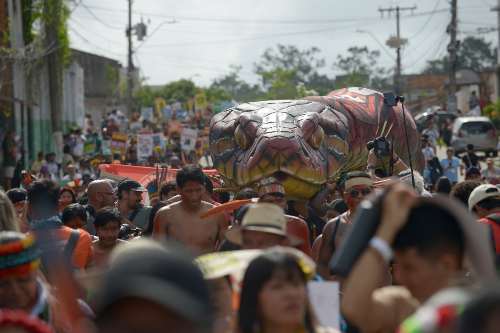 Imagem de abertura: Marcha Global Indígena reuniu líderes de povos tradicionais que estão em Belém para cobrar reconhecimento pelos territórios indígenas Foto: Luis Ushirobira/InfoAmazonia