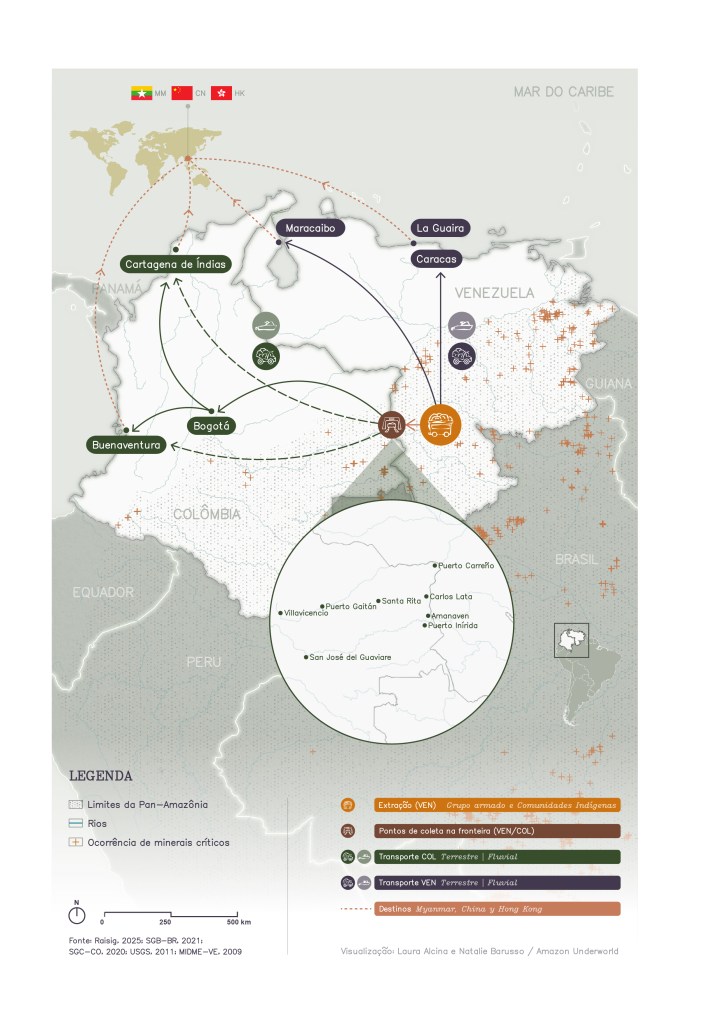 Foi tecida uma complexa rede de atores em torno dos minerais críticos da Amazônia. Alguns operam em corredores fluviais disputados, negociando com organizações guerrilheiras e forças da ordem corruptas. Outros, sob uma fachada de legalidade, movimentam grandes quantidades de material através de enormes cidades portuárias conectadas às rotas do comércio internacional, em uma série de operações que põem em risco o meio ambiente e a soberania dos países.