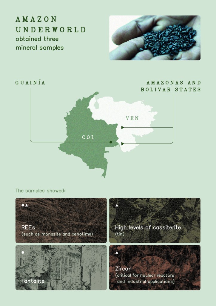 Amazon Underworld has spoken with Indigenous community leaders, miners, traffickers and traders, law enforcement officials, and geologists to gain a better understanding of this new mineral rush and its implications. Our team also received samples of so-called “black sands,” collected in Colombia’s Guainía department and Venezuela’s Amazonas and Bolívar states. This concentrate contains some of the world’s most sought-after critical minerals, hidden deep in the rainforest. When evaluated in a professional geological laboratory, test results indicated high levels of tin and tantalum, as well as monazite and xenotime, which contain rare earths.