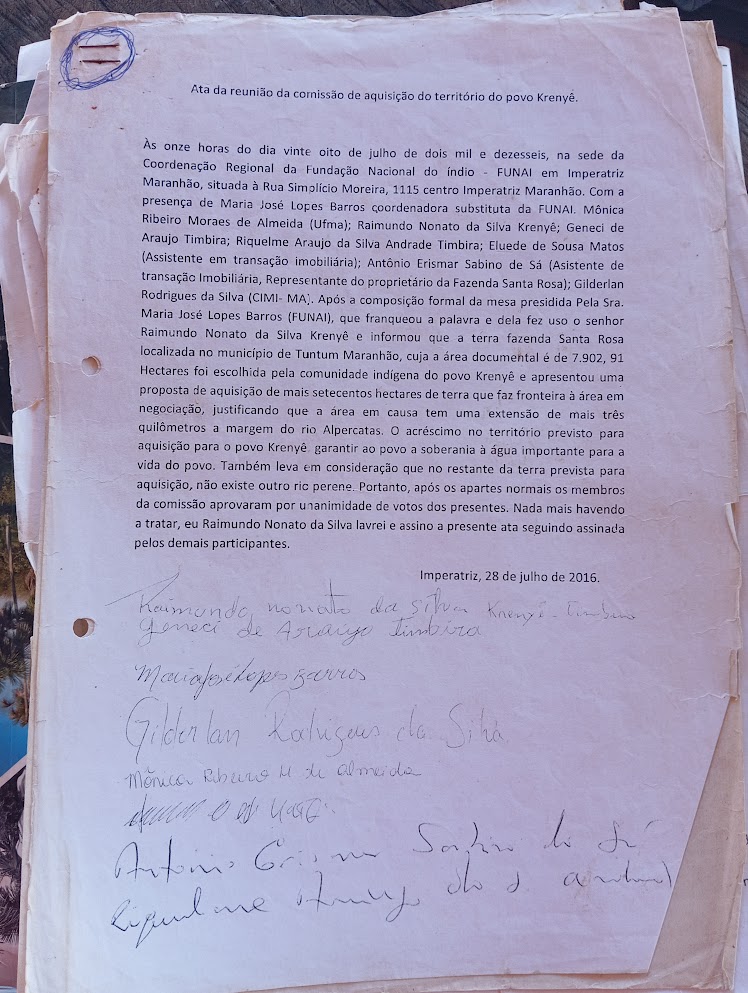 With some pride, Cu’tetet keeps the minutes of one of the final meetings that selected the land. After visiting several areas, on July 28, 2016, a commission agreed to purchase the property of just over 8,000 hectares in the municipality of Tuntum, also in Maranhão.