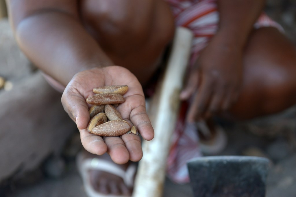 “Today we have to go very far to get the babassu, and we depend on a car from the City to bring them home and break them,” says Maria Vilani Lopes, 32. The AMQCB pays R$ 6 per kilo of babassu, which is processed into products. “On a good day I can break 10 kilos,” she says.