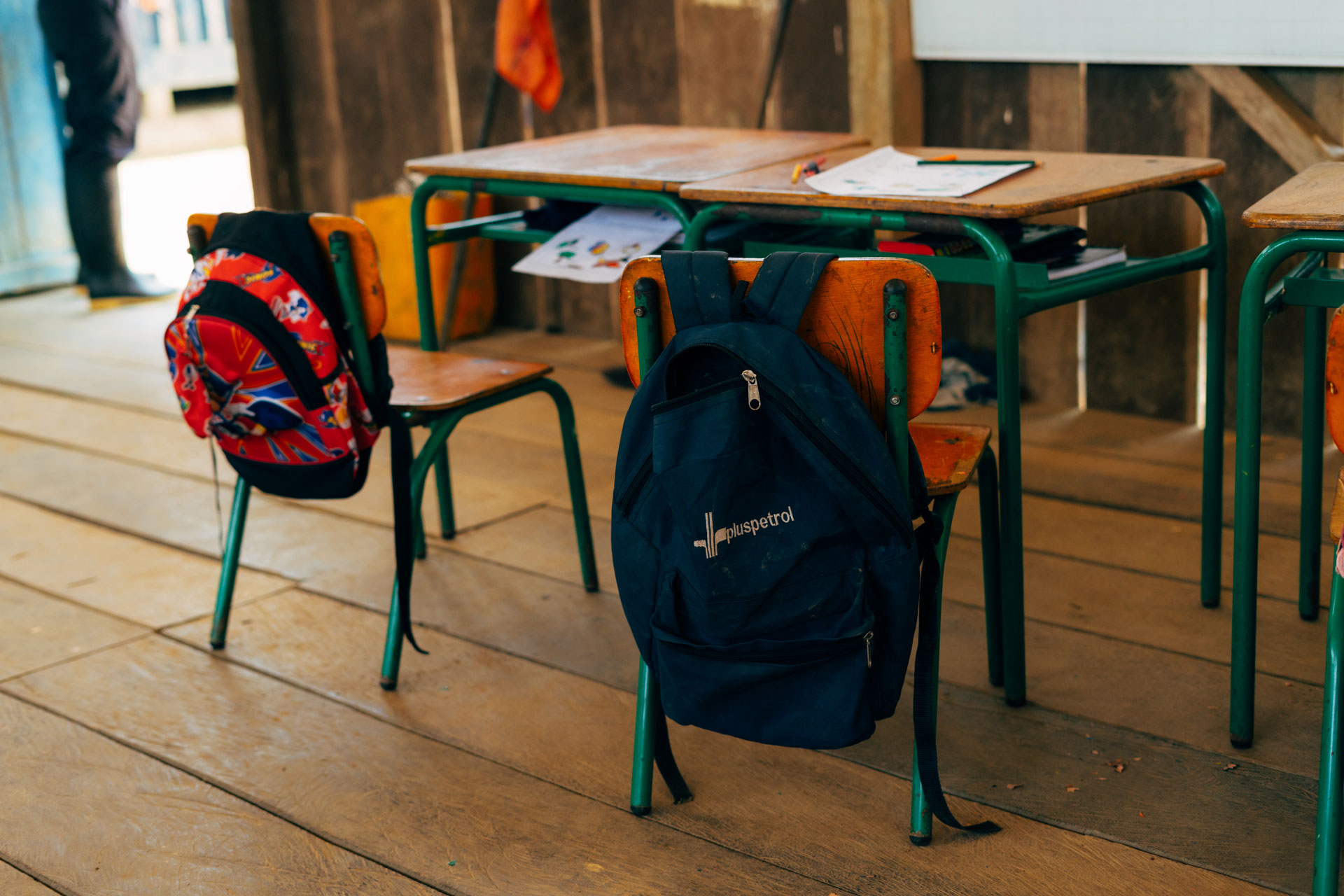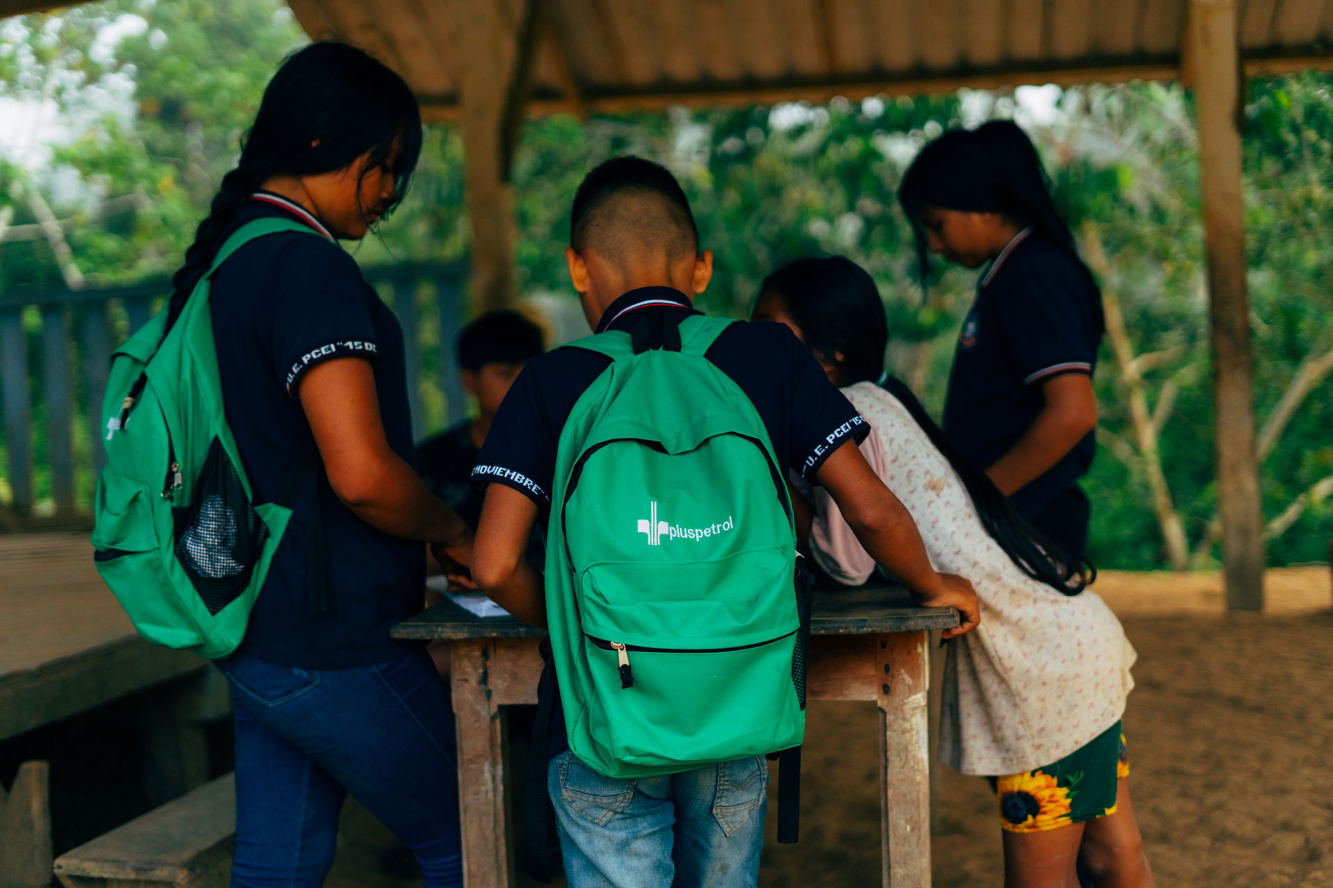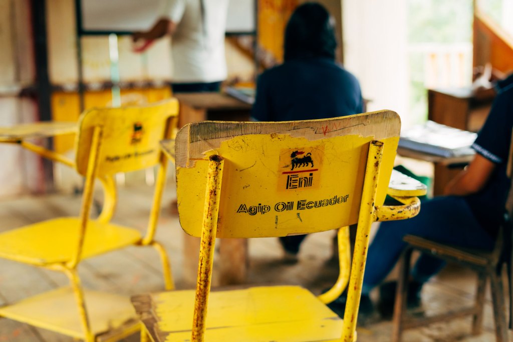El rol que asumen las petroleras con la educación es evidente en el colegio de la remota comunidad de Piwiri. Entre paredes de madera rotas, despintadas e incompletas, hay bancas de un amarillo gastado y un metal oxidado con el logo de Agip Oil. Sobre esas bancas cuelgan brillantes mochilas verdes y azules con el logo de Pluspetrol. Los cuadernos y plumas que usan los estudiantes y las colaciones que comen también fueron donados por la empresa. Los uniformes fueron pagados por los padres.