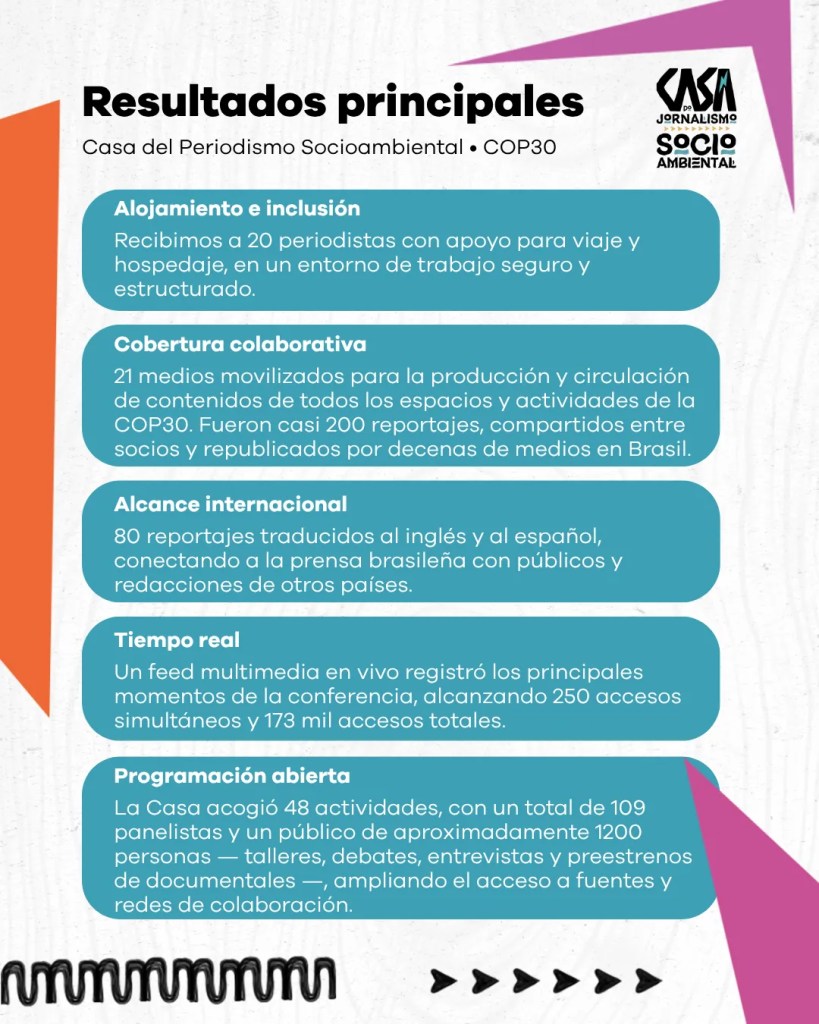 La Casa consolidó una nueva forma de hacer periodismo: compartida, colaborativa y descentralizada; un modelo replicable para grandes coberturas que exigen capilaridad territorial, rapidez y profundidad. El proyecto fortaleció redes, mejoró la calidad de la información disponible para el público y marcó la COP30 como uno de los mayores ejercicios colaborativos del periodismo socioambiental en Brasil.