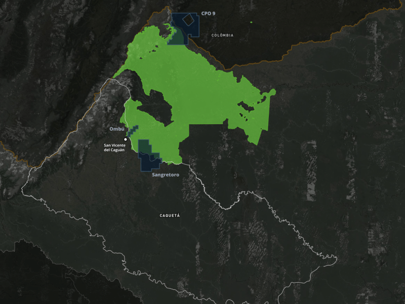 Visualizações destacando blocos de exploração de petróleo na Colômbia, sobrepostos à área de preservação ambiental AMEM.